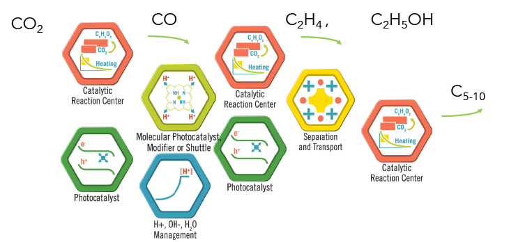 We expect assemblies of chemical microenvironments for artificial photosynthesis will exhibit characteristics similar to natural photosynthetic systems. These microenvironment assemblies include photocatalysts, carbon dioxide adsorption, membrane and porous media for ion and molecular transport, media for proton and cation management, molecular and inorganic photo- and electrochemical reaction centers, thermocatalytic reaction centers, and reactant/product separation media. They are designed to be simultaneously higher-performing and durable.